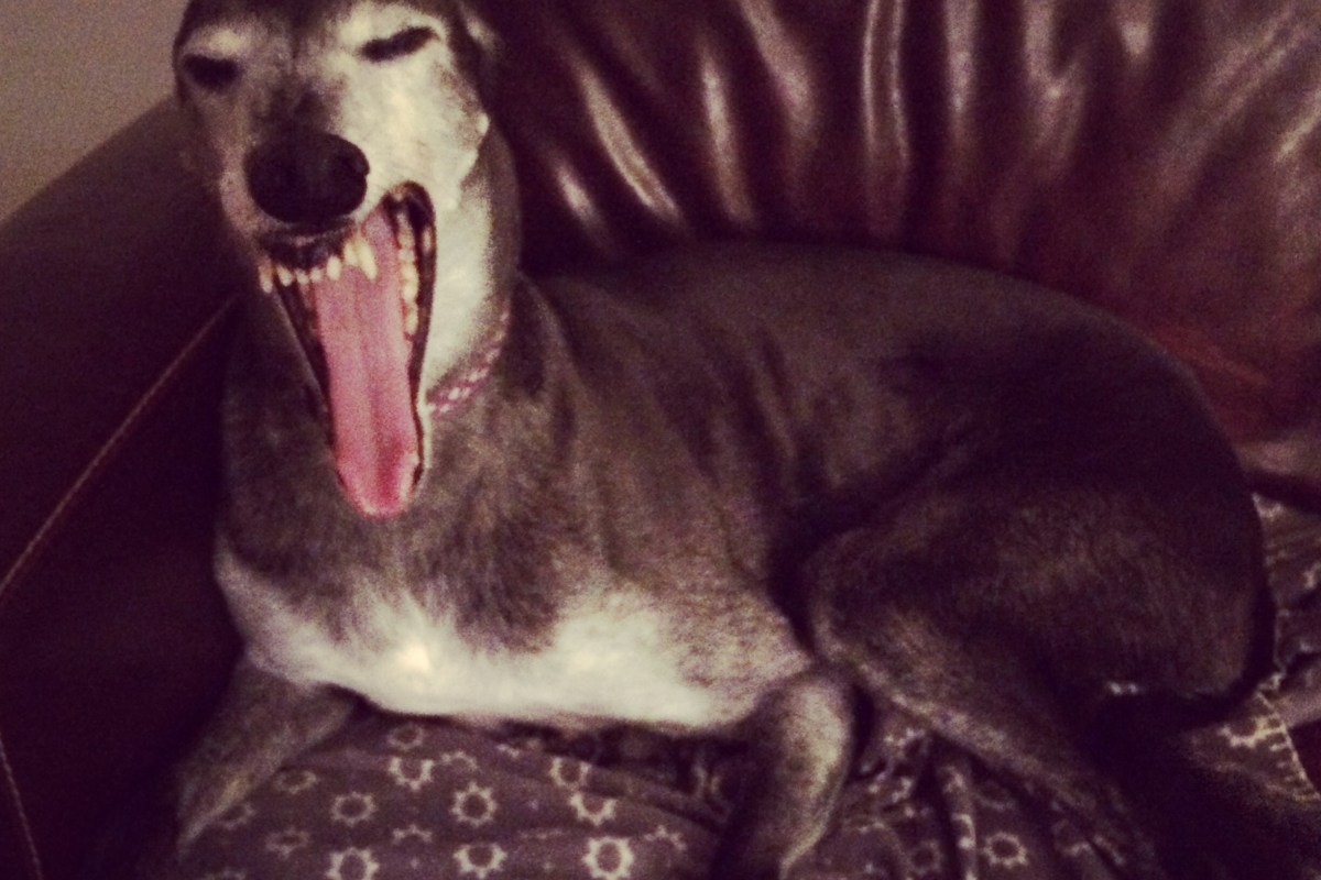 ** of course that’s not a monster in the picture. That’s my girl greyhound Wendy, mid-yawn, displaying what a fine set of teeth she still has at the grand old age of 11